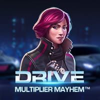 Drive: Multijugador Mayhem es una tragamonedas de 5 carretes con 3 filas y 15 líneas de pago fijas; los símbolos son metálicos y giran en carretes transparentes contra un fondo de centelleantes rascacielos debajo de un cielo negro sin estrellas.